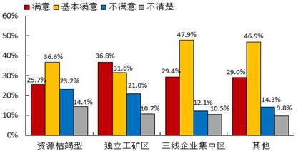调查显示,对当地棚户区改造政策措施落实情况,参与改造的棚户区居民[1]表示“满意”的占29.1%,表示“基本满意”的占43.6%,合计为72.7%;其中国有林区(林场)、三线企业集中区棚户区居民的合计比重分别达87.7%、77.3%,而国有工矿、资源枯竭型城市棚户区居民的合计比重仅分别为67.1%、62.3%。