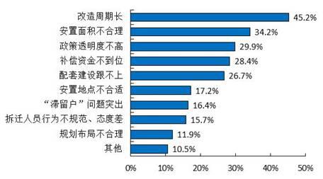 调查显示,对棚户区改造过程中存在的突出问题,棚户区居民认为是“改造周期长”的比重较高,占45.2%;认为是“安置面积不合理”、“政策透明度不高”、“补偿资金不到位”、“配套建设跟不上”的分别占34.2%、29.9%、28.4%、26.7%。