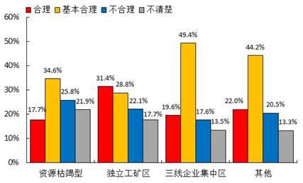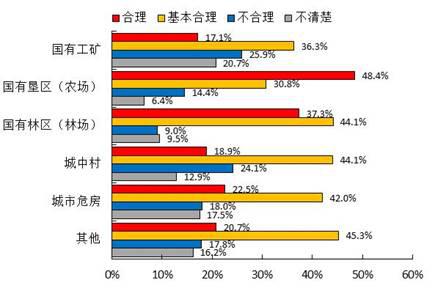 调查显示,对棚户区改造中拆迁安置补偿标准,参与改造的棚户区居民认为“合理”的占21.6%,认为“基本合理”的占41.7%,合计为63.3%;其中国有林区(林场)、三线企业集中区、改造已完成棚户区居民的合计比重分别达81.4%、69.0%、72.6%。